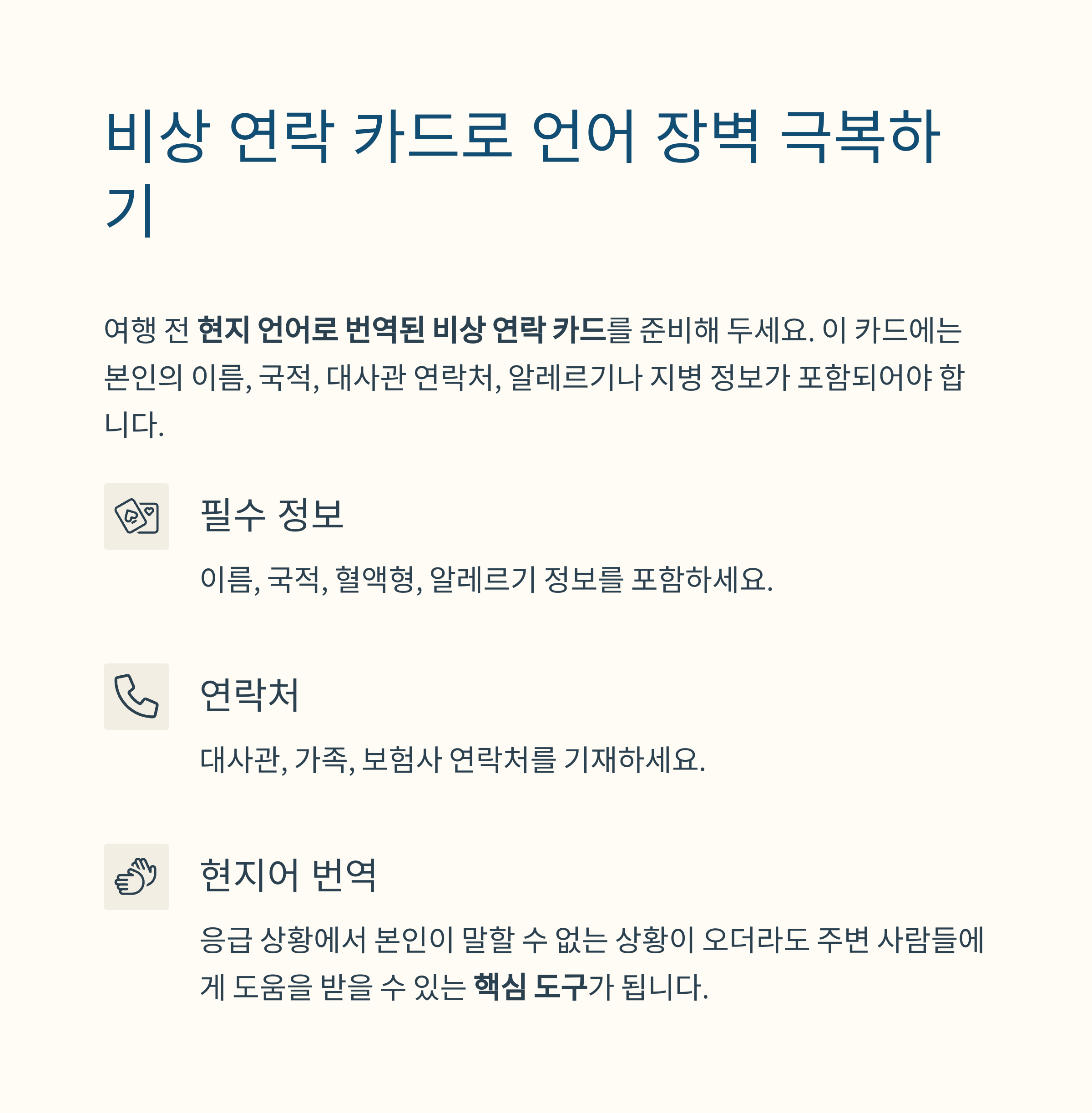 여행 전 현지 언어로 번역된 비상 연락 카드를 준비해 두세요.
