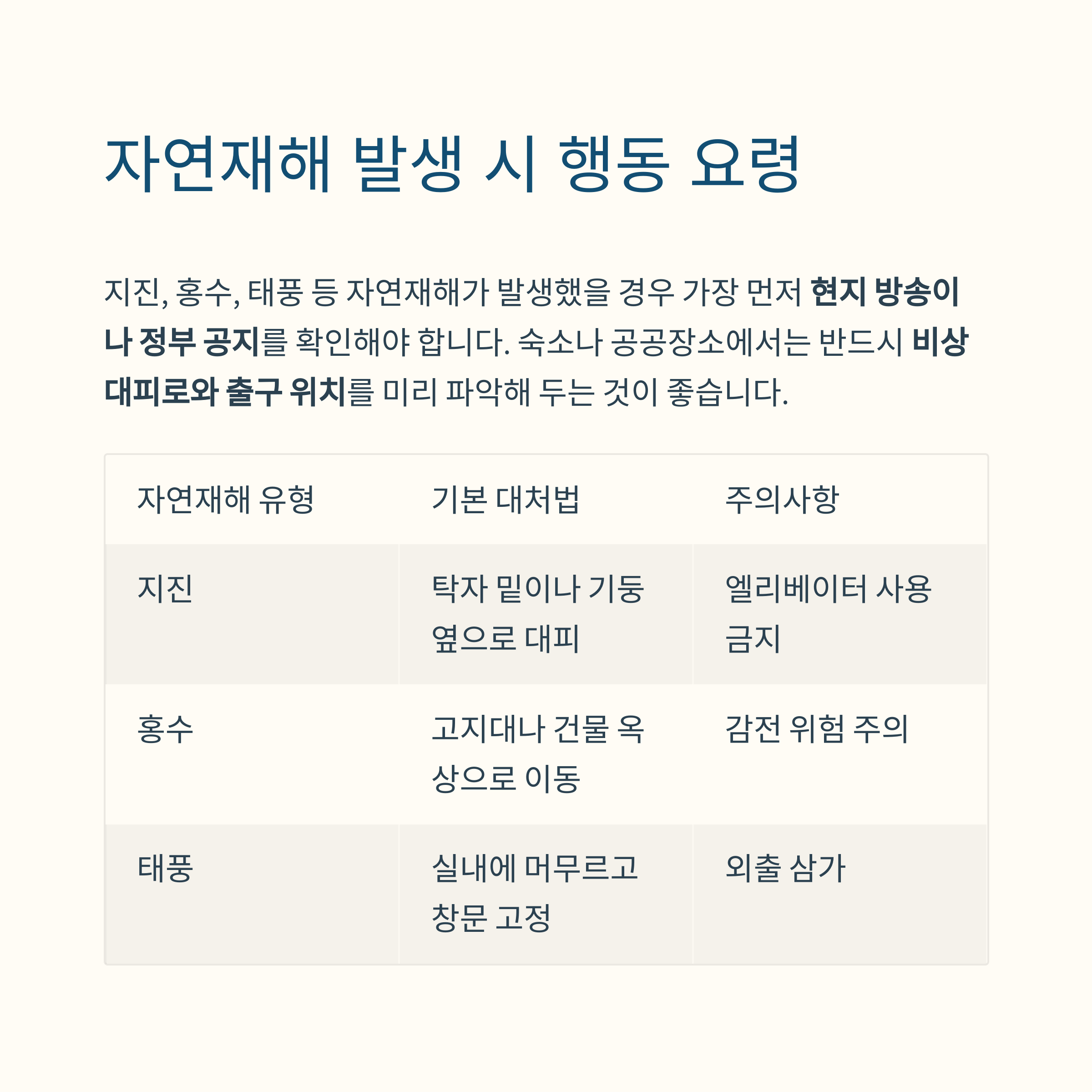 | 태풍 | 실내에 머무르고 창문 고정 | 외출 삼가 |