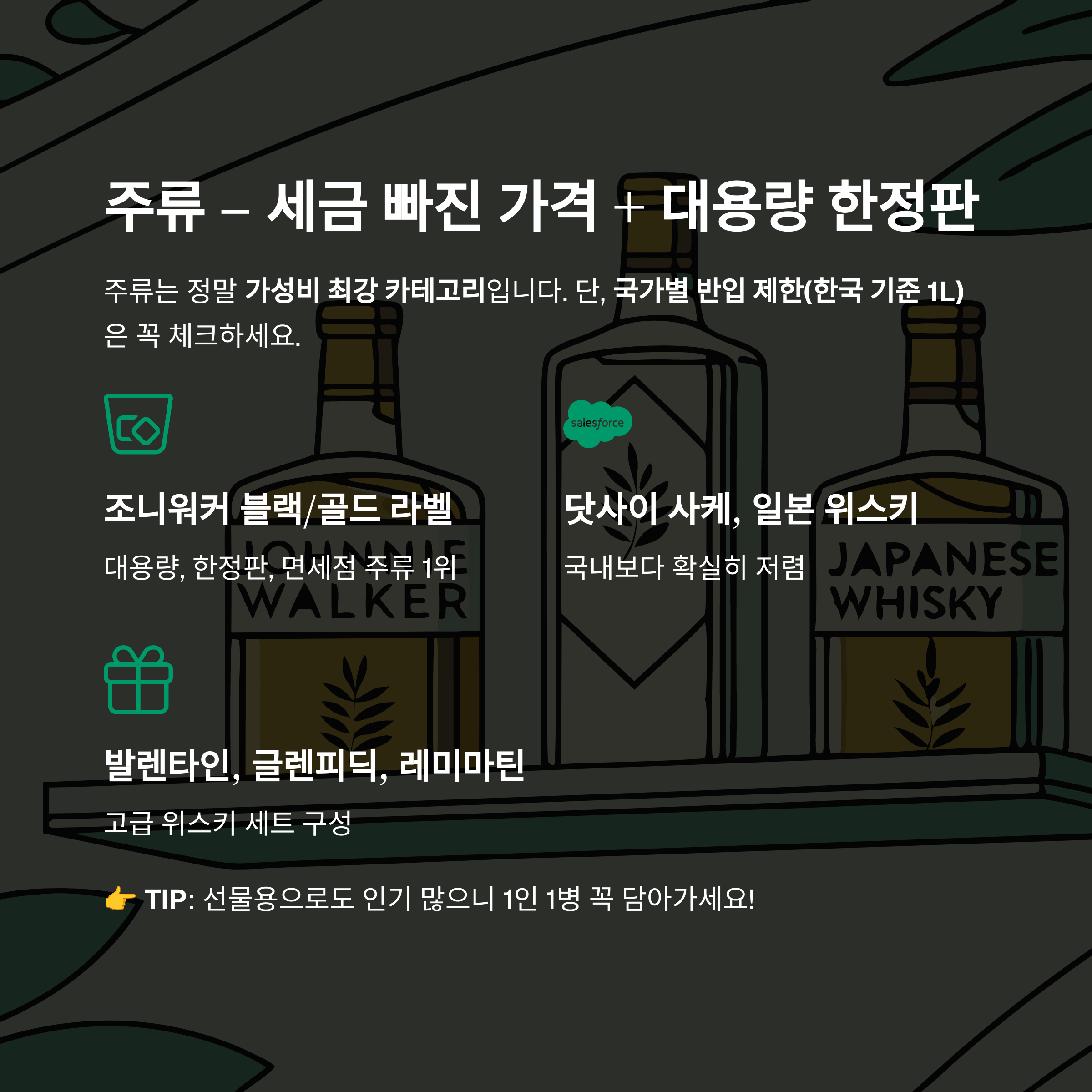 - 조니워커 블랙/골드 라벨: 대용량, 한정판, 면세점 주류 1위