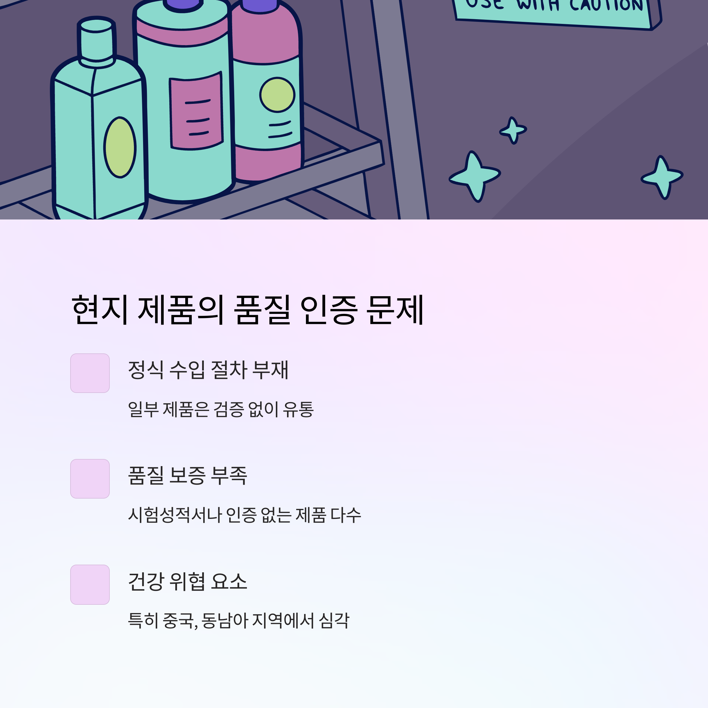 | 안전성 | 유해물질 검사, 품질표시제 | 성분 불분명, 위생 불확실 |