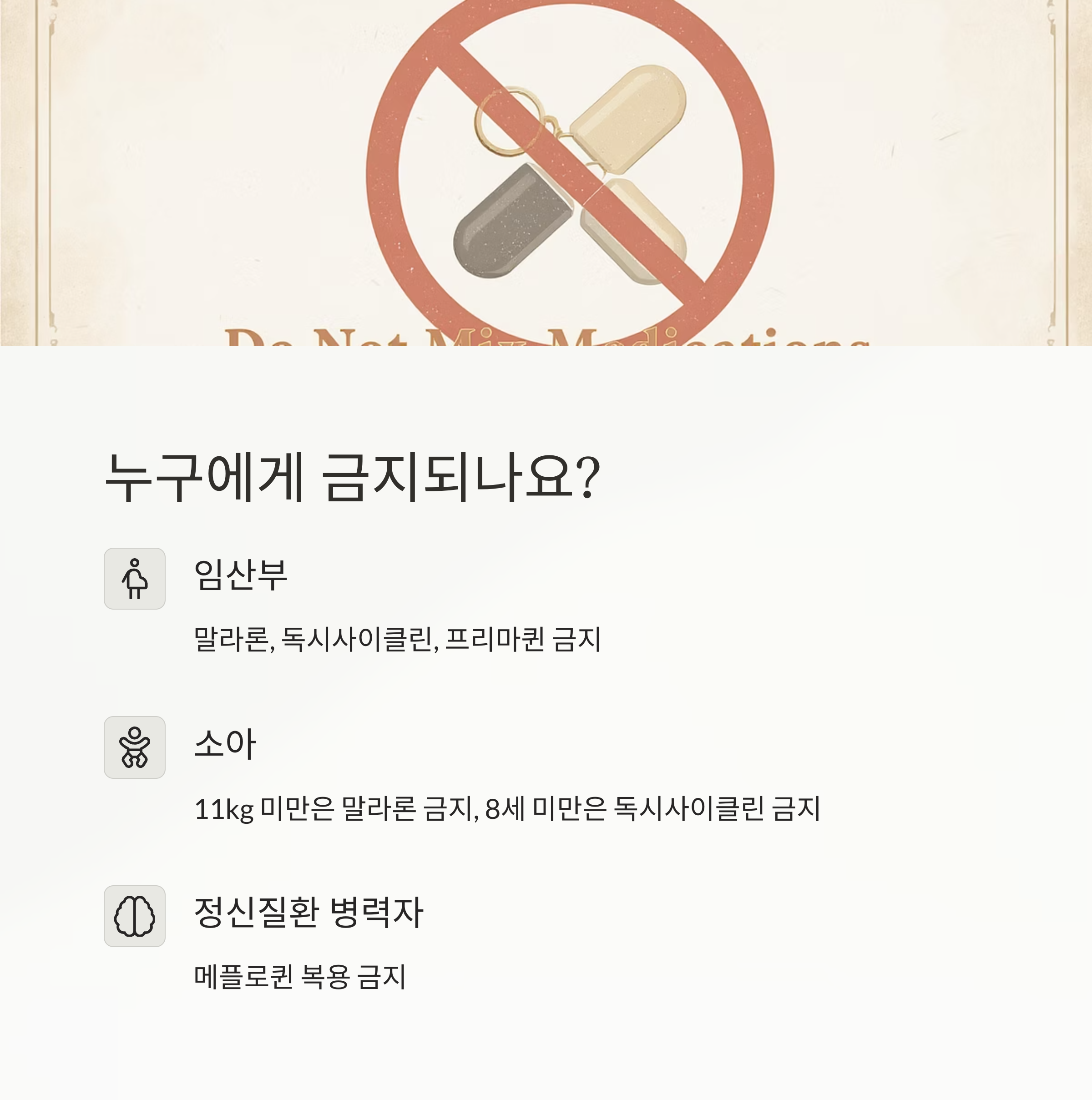 - 임산부: 말라론, 독시사이클린, 프리마퀸은 금지