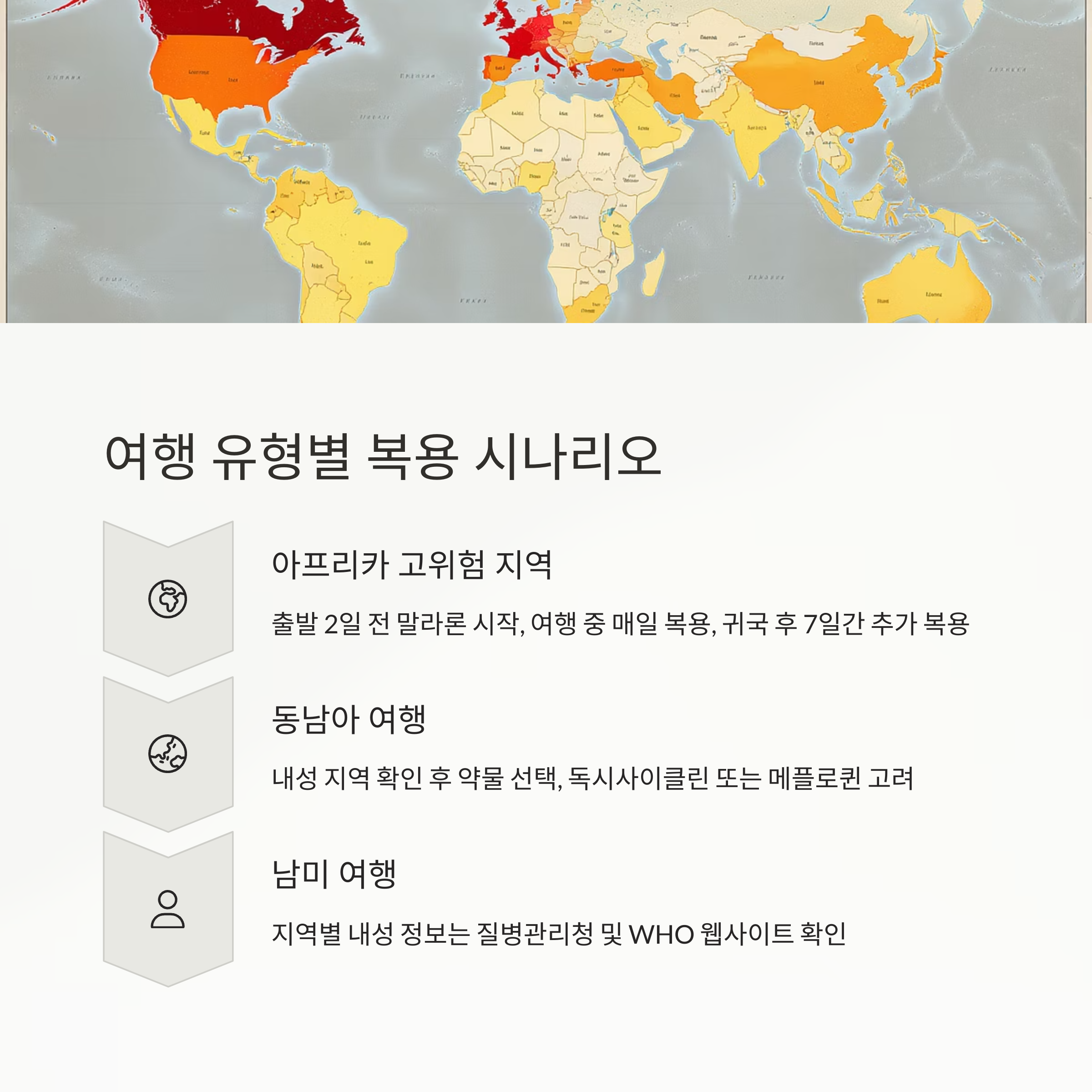 여행 목적지에 따라 복용 시점과 약물 선택이 달라지며, 복용 기간을 정확히 지키는 것이 감염 예방의 핵심입니다.