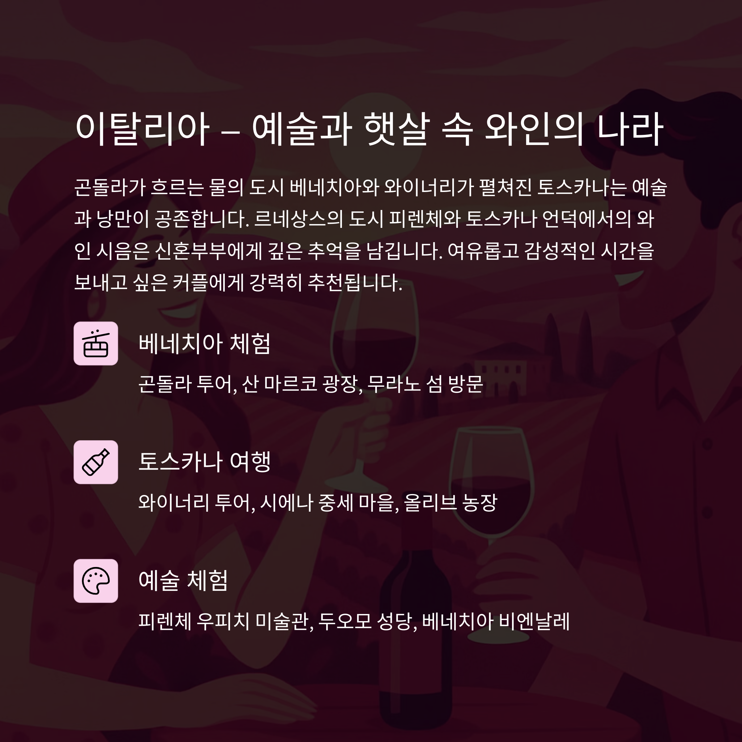 | 낭만과 감성 추구 | 이탈리아(베네치아/토스카나) | 와이너리, 예술, 햇살 속 산책 |