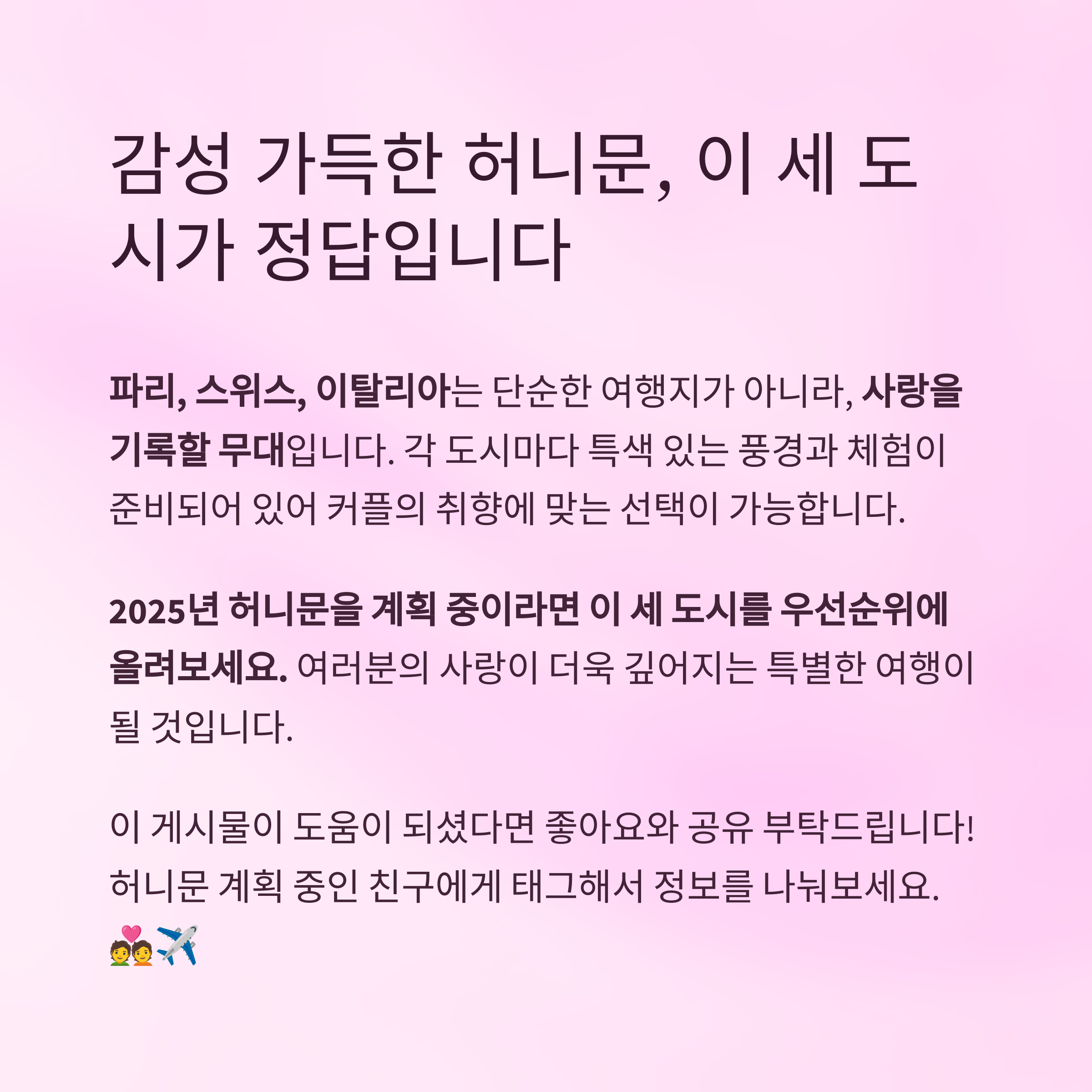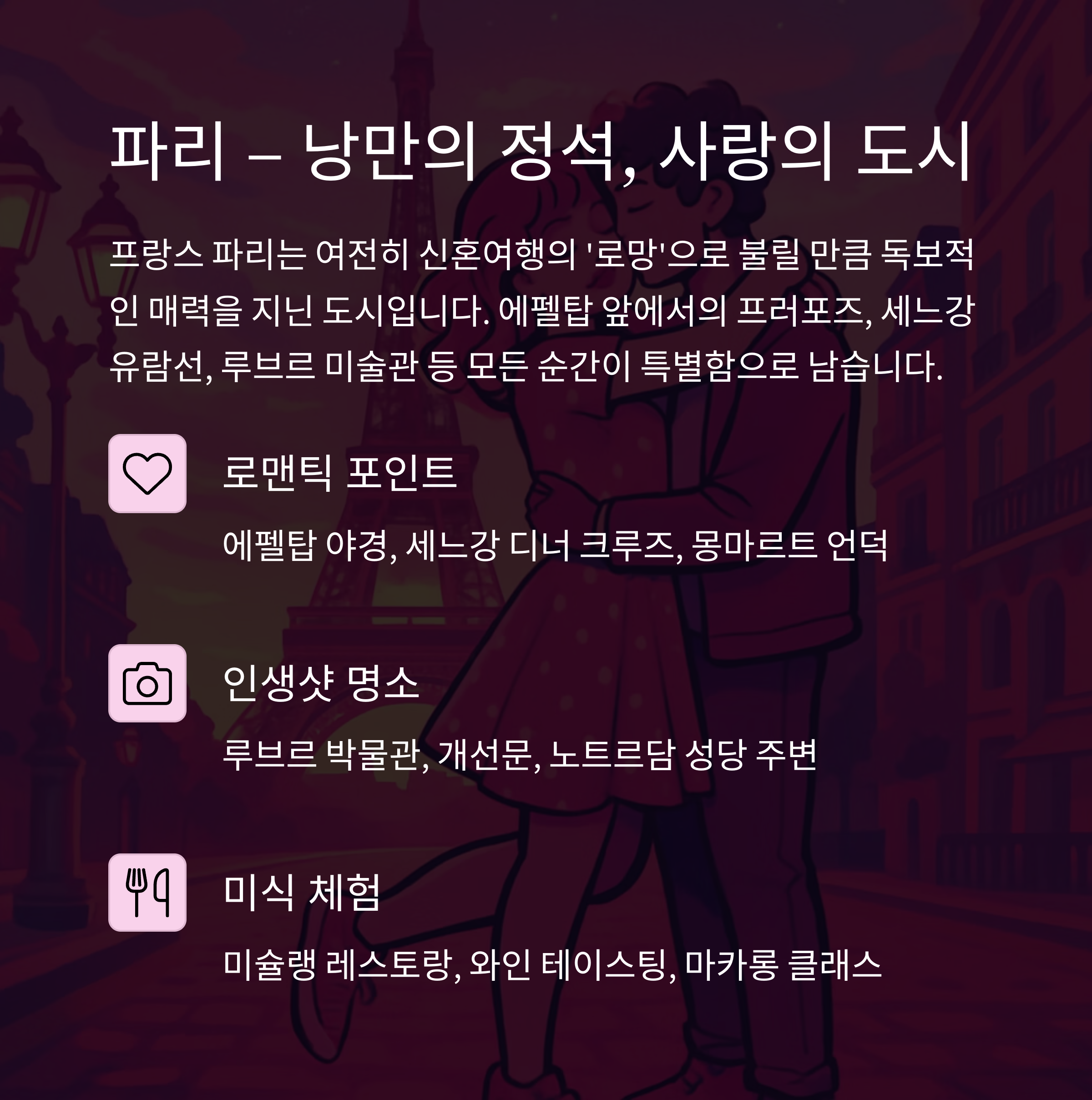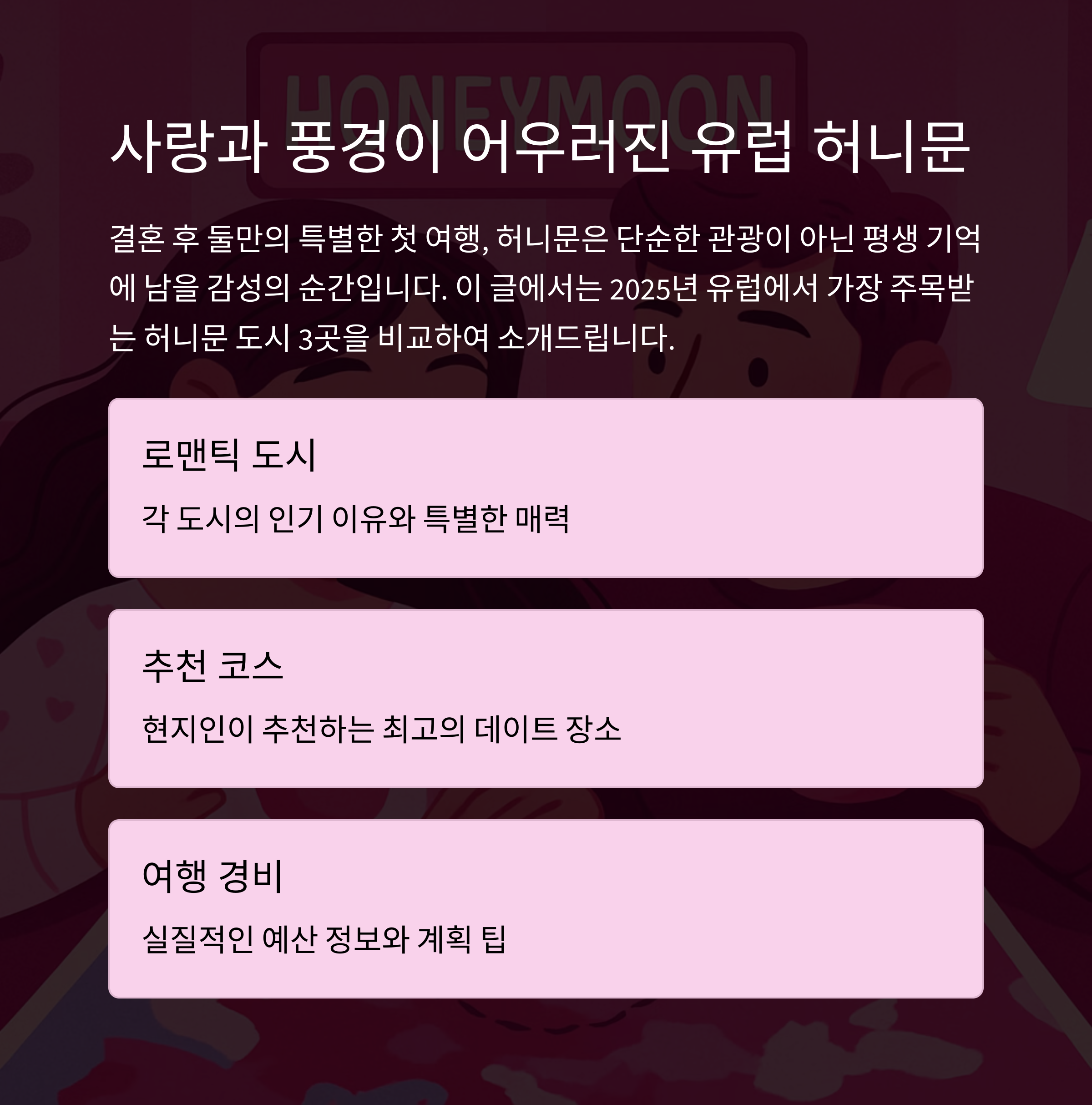 2025년 트렌드와 신혼부부 만족도를 기반으로 한 유럽 허니문 가이드입니다