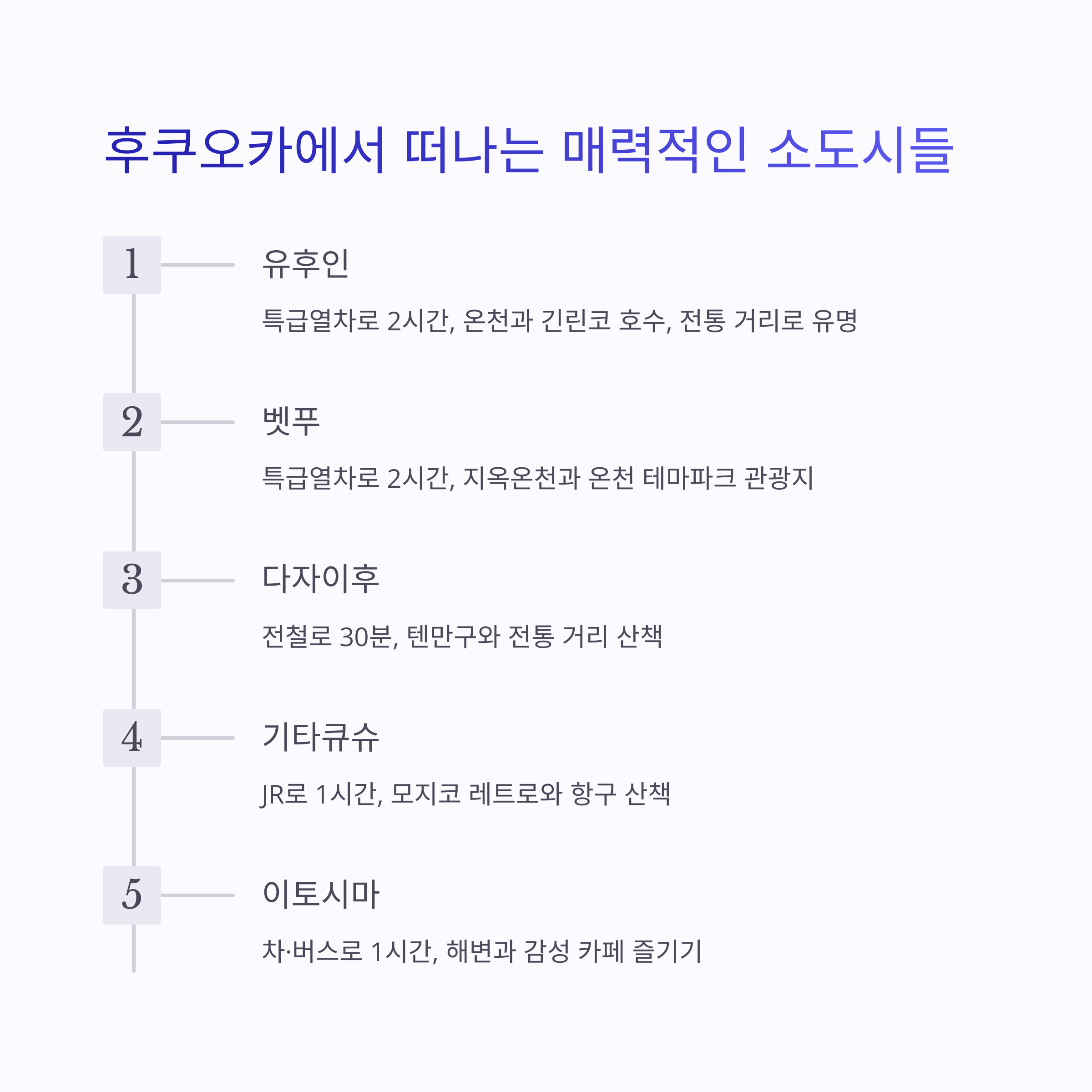 후쿠오카는 규슈의 관문 도시로, 교통이 편리해 다양한 소도시를