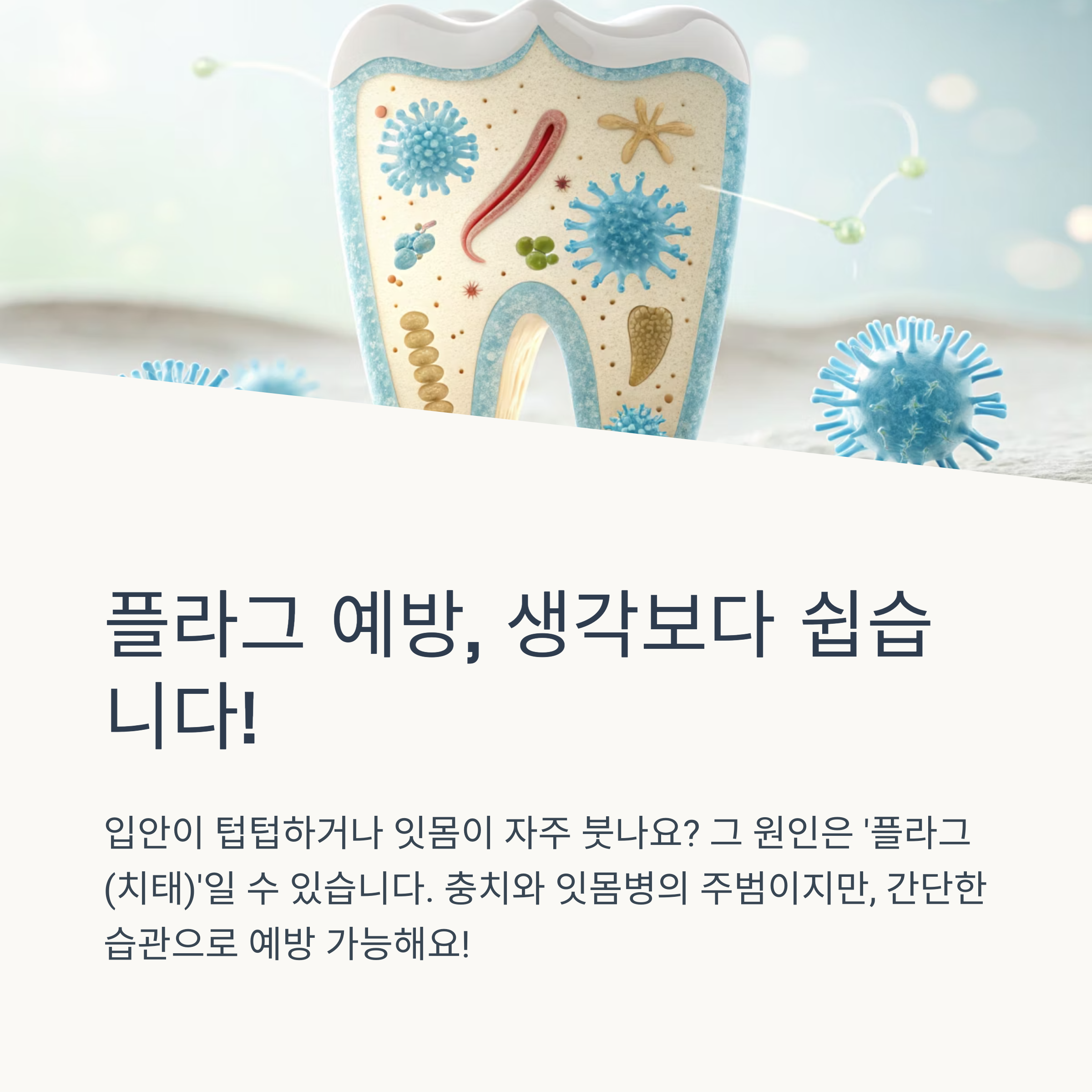 사실 그게 전부 ‘플라그(치태)’ 때문일 수 있다는 사실... 저도 몰랐는데 알고 보니 충치며 잇몸병의 핵심 원인이 이거더라구요! ㅠㅠ