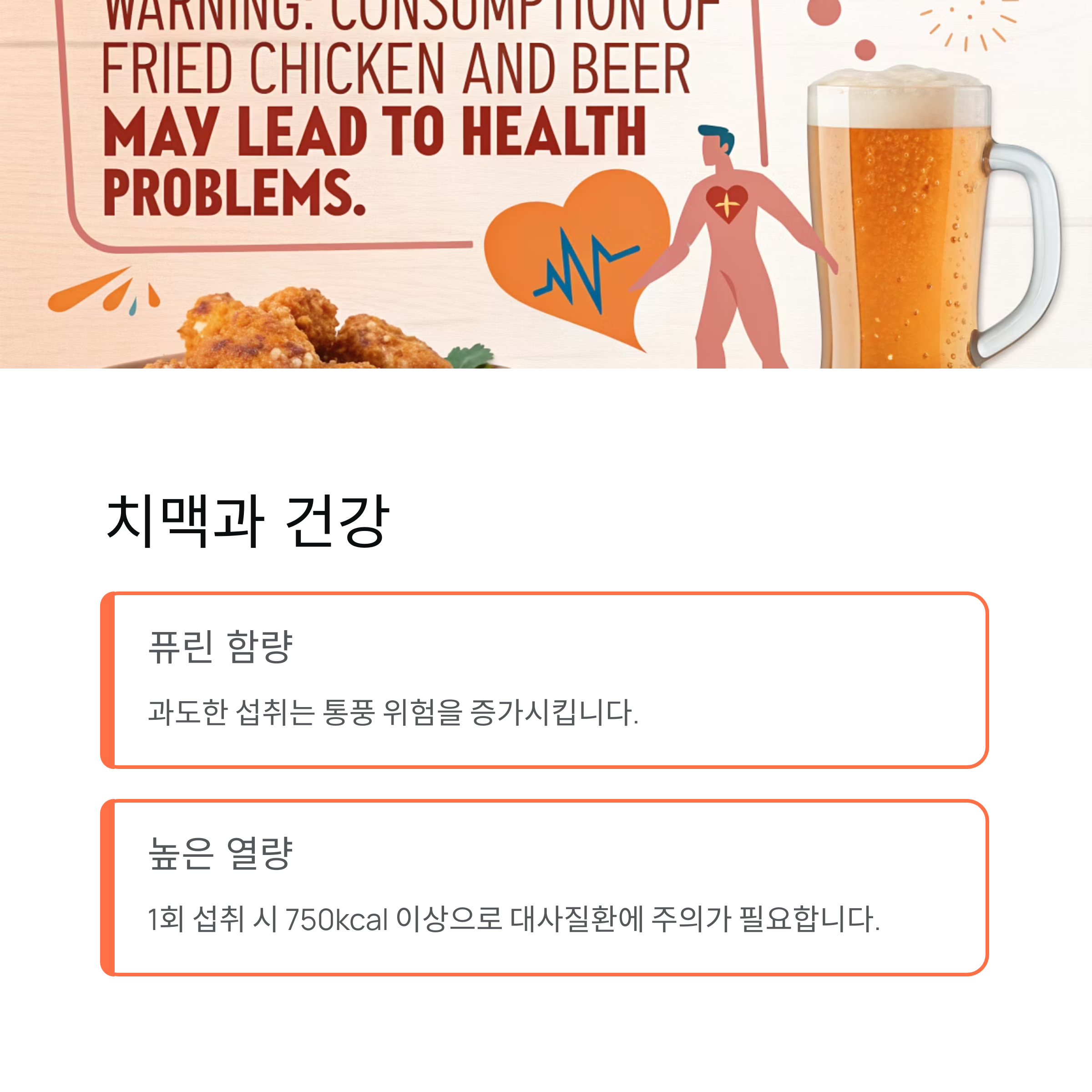 | 치맥과 건강 이슈 | 퓨린과 고열량으로 통풍 및 대사질환 주의가 필요합니다 |